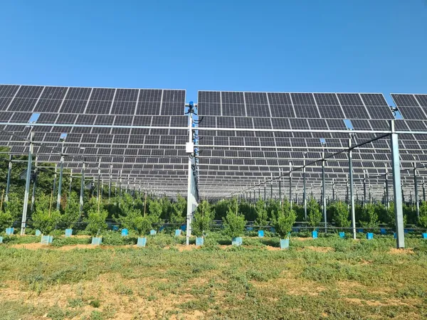En temps de fortes chaleurs, l’ombre des panneaux solaires apporte un rafraichissement essentiel aux arbres fruitiers de l’association de gestion de la ferme expérimentale d’Étoile-sur-Rhône (Drôme).