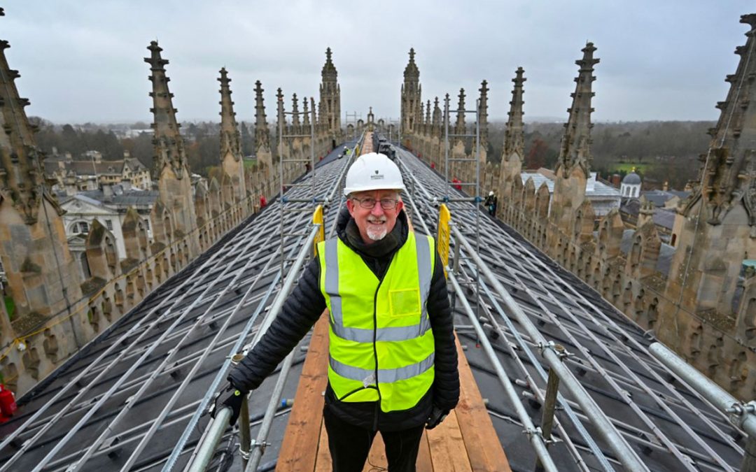 Des ouvriers s’affairent sur le toit de la chapelle de King’s College, à Cambridge, l’une des plus anciennes et célèbres d’Angleterre : ils posent despanneaux photovoltaïques, au grand émoi de défenseurs du patrimoine.